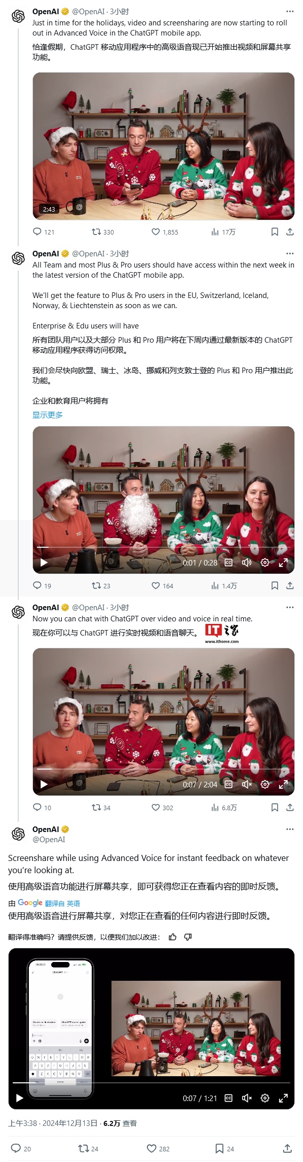 IT之家 12 月 13 日消息,“OpenAI 12 天”活动已进入第六天,OpenAI 公司宣布为 ChatGPT 的高级语音模式带来视频输入和屏幕共享功能,并为迎接圣诞节,限时推出全新的圣诞老人模式。