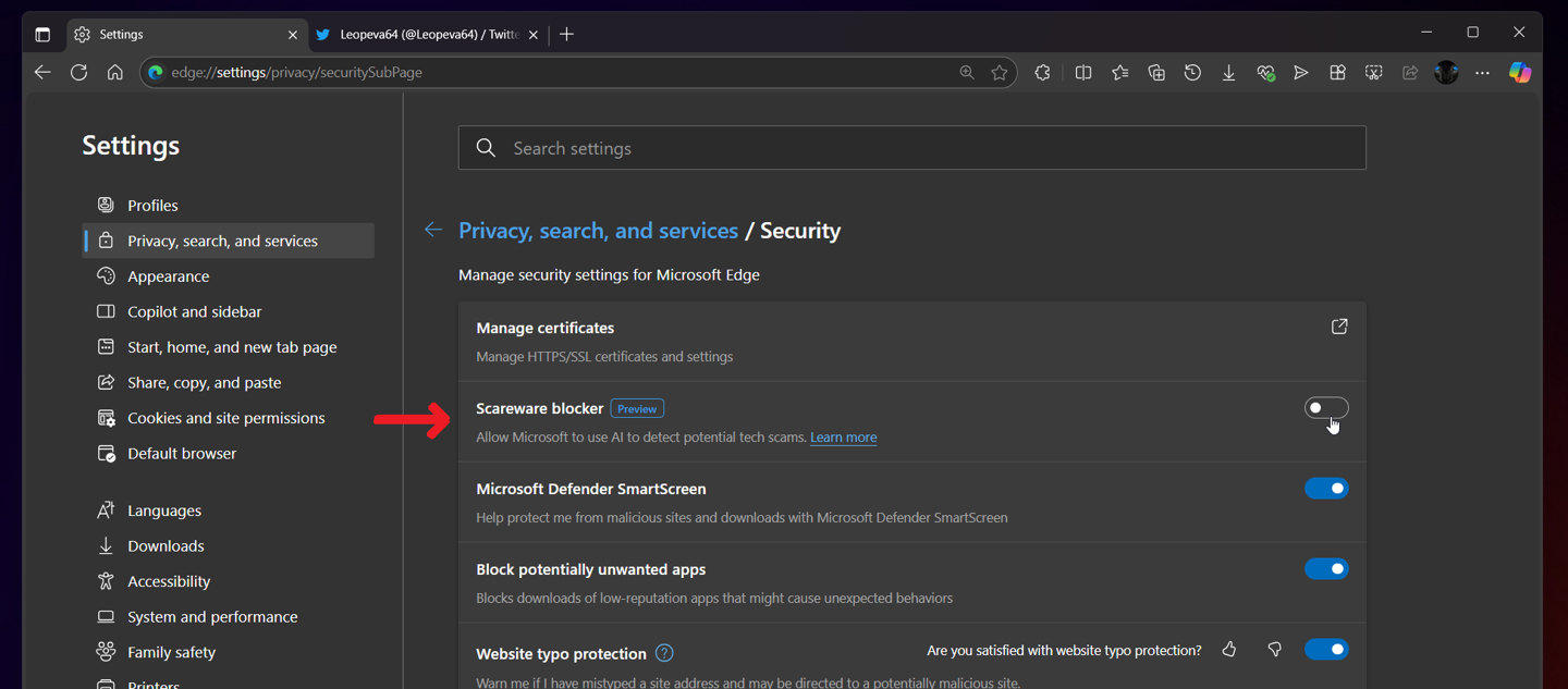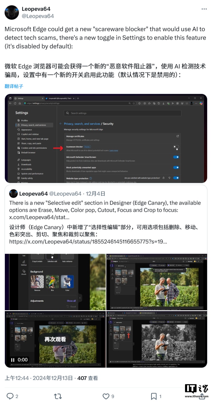 IT之家 12 月 13 日消息,根据长期挖掘浏览器功能的博主 Leopeva64 今天凌晨发布的 X 帖子,微软似乎正在通过 Edge 浏览器测试一款名为“Scareware Blocker”(恐吓软件拦截器)的新功能。