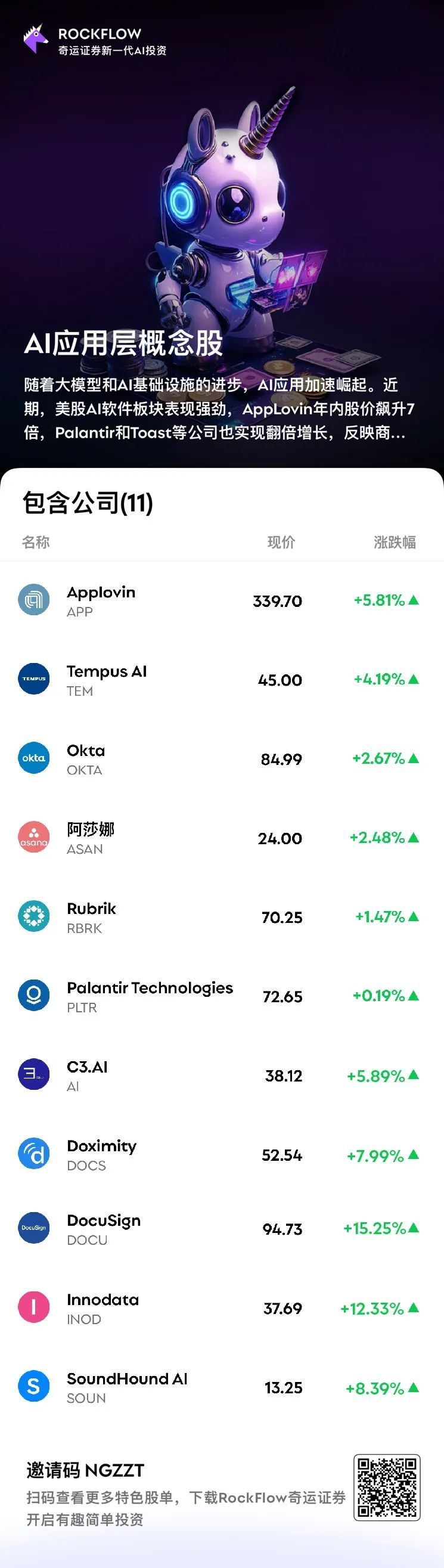 RockFlow 为大家梳理了相关标的,扫码即可关注 AI 应用层概念股的后续表现,并一键下单参与后续行情: