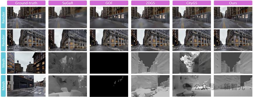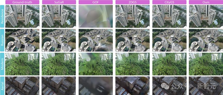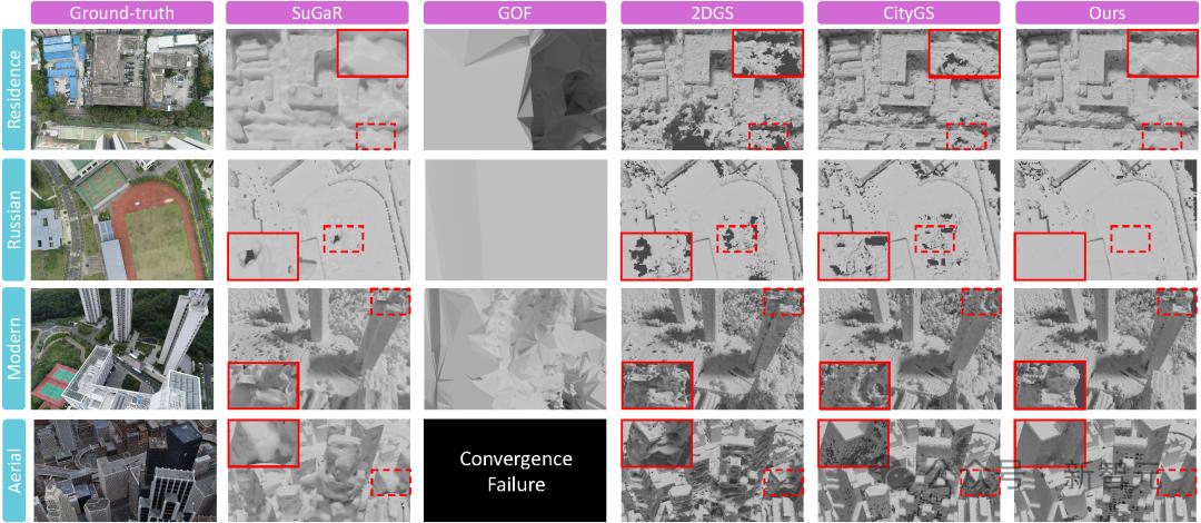 从不同算法在大规模场景下的几何重建效果中可以看出,SuGaR的模型容量有限,难以还原精细的几何结构;GOF受到严重的模糊鬼影的干扰,许多视角下画面被鬼影完全遮挡,以至于监督失效,重建结果面对显著的欠拟合;2DGS受到模糊鬼影的影响较弱,但也妨碍了其收敛效果,并且退化现象容易诱发高斯基元的过度增长,进而引起显存爆炸,训练难以为继。