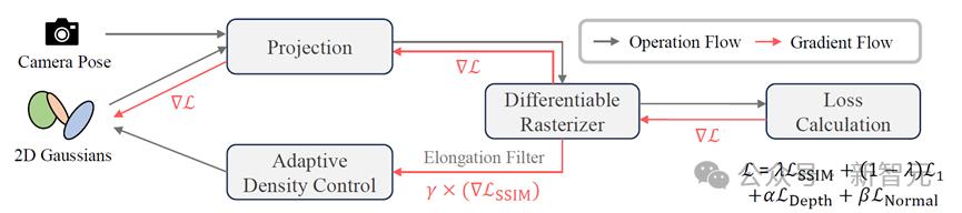 2DGS旨在增强几何重建精度,并将椭球降维为椭圆面片作为基元表征场景,同时对渲染出的深度和法向量分布施加监督,保证重建表面的平整性。