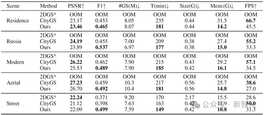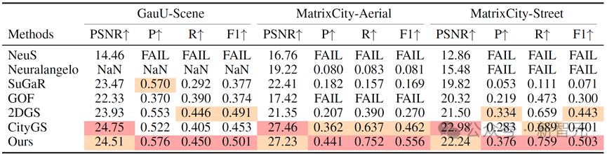 在实验中,相比于已有算法,CityGaussianV2在几何精度(精度P,召回率R,综合指标F1-Score)方面达到了最佳的性能表现。