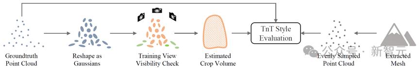 具体而言,点云真值会首先被初始化为3DGS,在遍历所有训练视图的同时记录每个点的观测频次,观测频次低于阈值的点将被滤除;剩余的点将用于估计垂直方向的高度分布范围,以及地平面内的多边形外接轮廓,二者构成的Crop Volume进一步用于TnT形式的指标计算。