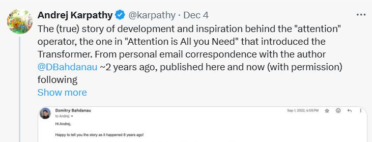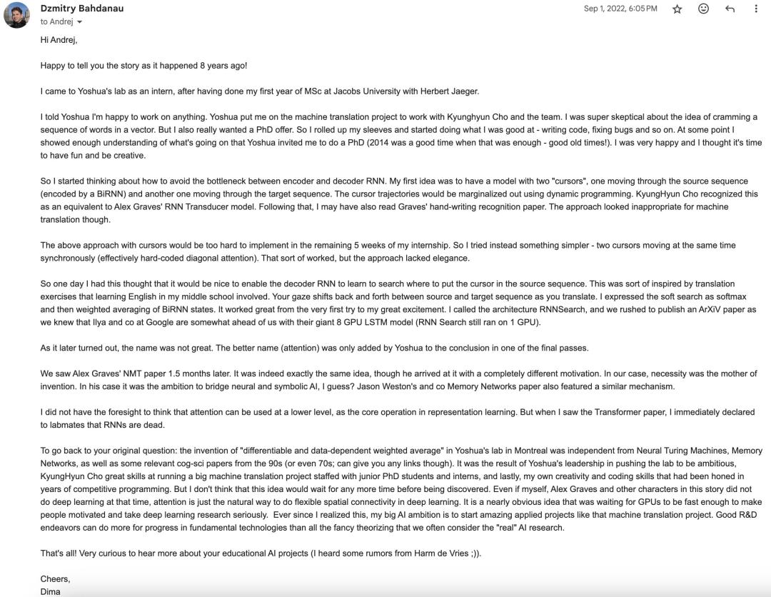 最近,Andrej Karpathy在社交媒体上公开了与第一作者Dzmitry两年前的联络邮件,详细叙述了这段发明注意力的故事,顿时又掀起网友热议。