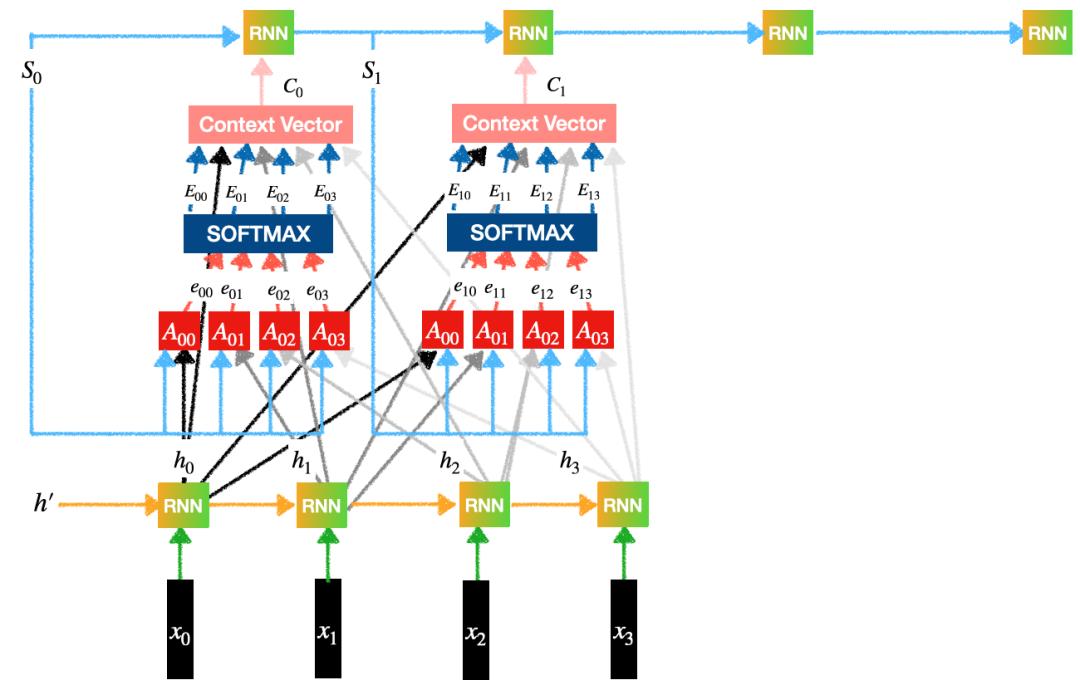 某一天,Dzmitry受到了英语翻译练习中的启发,人类在翻译时,目光会在源序列和目标序列之间来回移动,将软搜索表示为softmax,然后对BiRNN状态进行加权平均,就能让Decorder RNN学会在源序列中搜索放置光标的位置。
