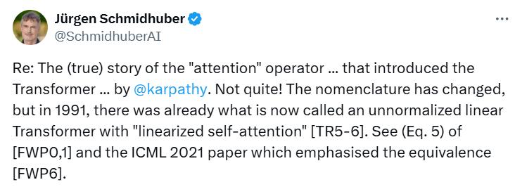 不过,LSTM作者Jürgen Schmidhuber却不认可这段故事,而是表明自己才是真正的创造者,1991年就已经提出线性复杂度Transformer,并且在两年后提出术语「注意力」,他在2023年12月还发表过一篇报告,控诉图灵奖三巨头抄袭自己的研究成果。
