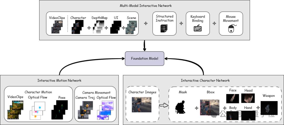 在交互性实现上,YingGame 结合了多个Interactive Network模块:理解用户输入的多模态交互方式,实现多样动作控制的多模态交互网络 — MMIN (Multi-Modal Interactive Network);实现复杂与连续角色动作生成的动作网络 — IMN (Interactive Motion Network);自定义角色生成与提高角色生成质量的角色网络 — ICN (Interactive Character Network)。
