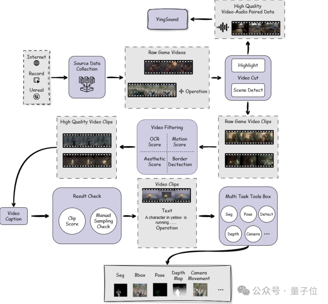 此外,为实现高质量训练数据构建,巨人AI团队设计了一条高效的游戏视频数据处理管线: