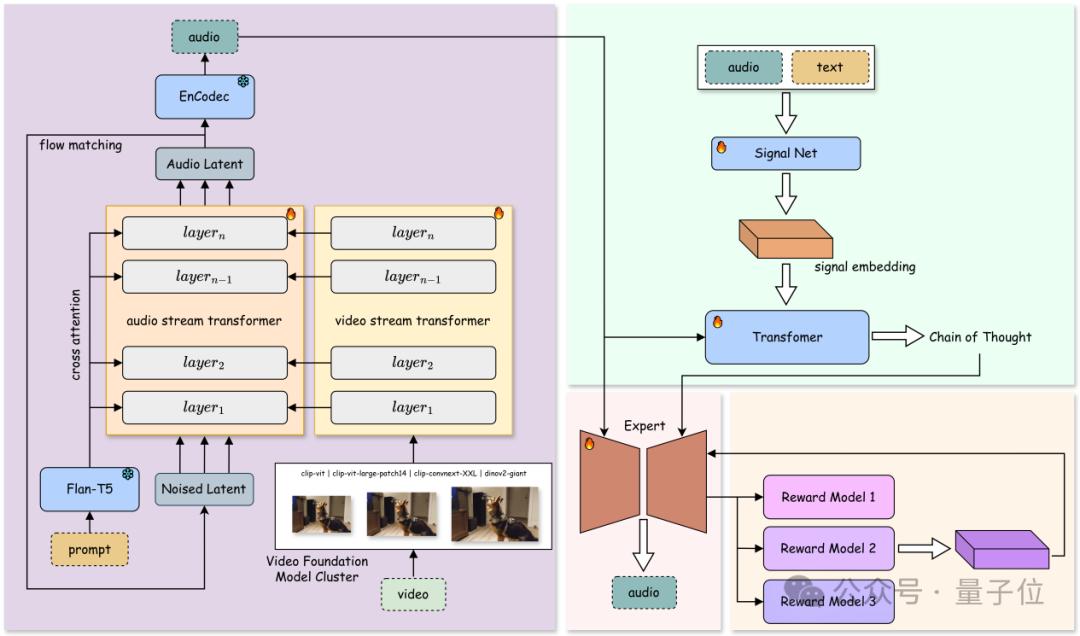 研究团队公开了 YingSound 的两个核心模块:基于 DiT 的 Flow-Matching 构建的音效生成模块,以及多模态思维链(Multi-modal CoT)控制模块,为音效生成提供精准支持。
