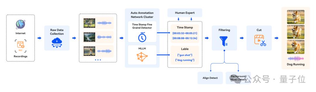 团队精心构建了符合行业标准的V2A(video-to-audio)数据集,覆盖了电影、游戏、广告等多场景、多时长的音视频内容。为确保数据质量,研究团队还设计了一套完善的数据处理流程,涵盖数据收集、标注、过滤和剪辑。针对不同视频类型的复杂性与差异性,团队基于多模态大语言模型(MLLMs)及人工标注,完成时间戳和声音事件的高质量标注。同时,通过严格筛选,过滤掉背景音乐干扰及音视频不同步的内容,最终生成符合行业标准要求的训练数据,为后续研究与开发提供了坚实基础。