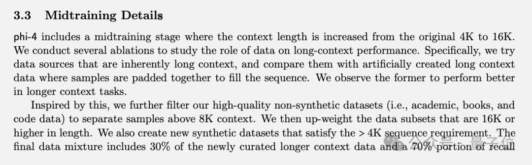 在10万亿tokens规模的预训练完成后,Phi-4可以处理4k长度的上下文窗口,而midtraining的目的是在此基础上进一步将窗口长度提升到16k。