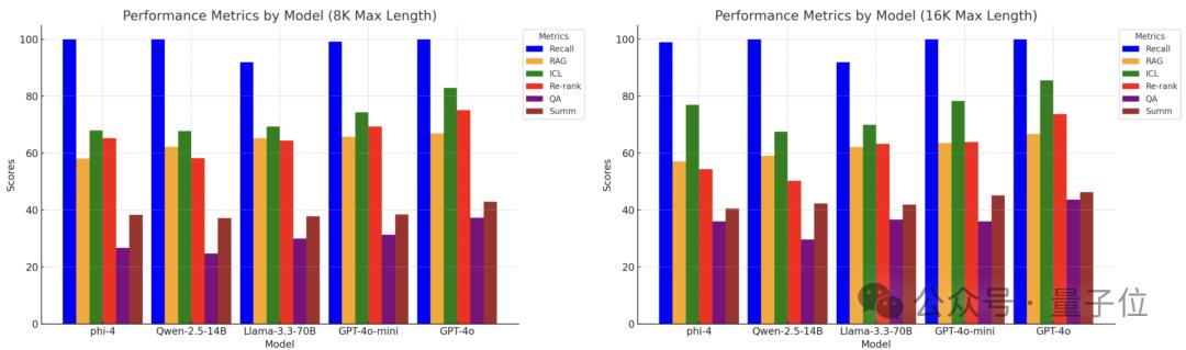 在8K和16K两种窗口长度中,研究团队利用HELMET基准评估了Pho-4和其他模型在RAG、QA问答、长文本摘要等任务上的水平。