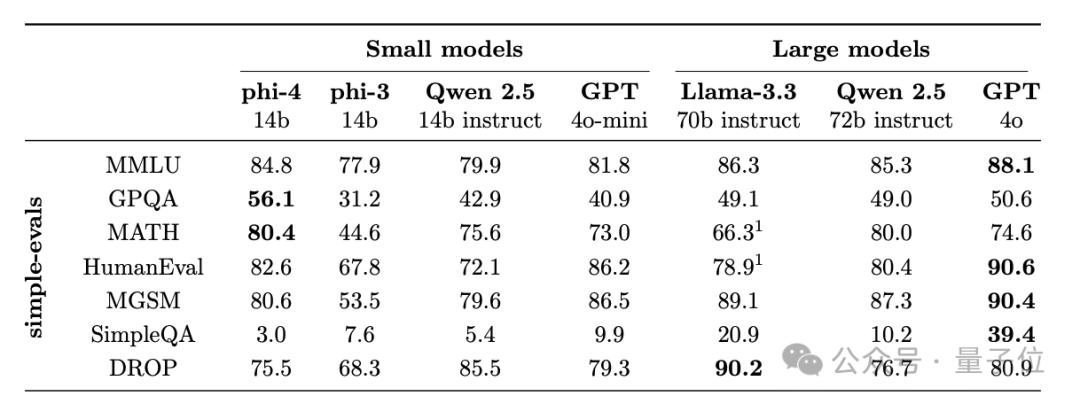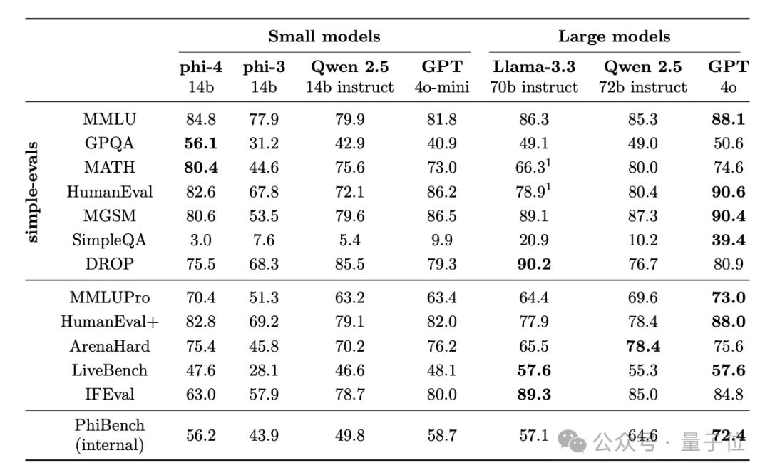 结果,Phi-4在多个任务上与同尺寸的Qwen 2.5-14B相当,部分指标还可与70B的Llama 3.3一决高下。