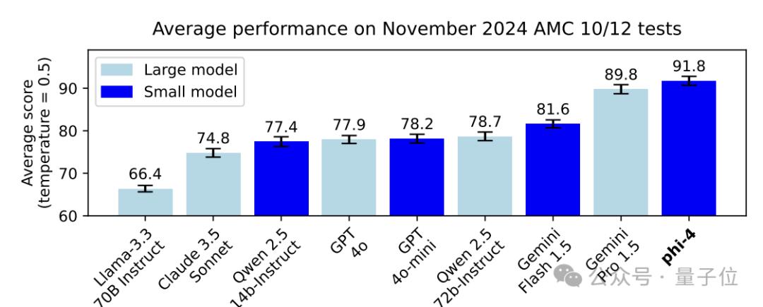 数学能力上,Phi-4在美国数学竞赛AMC 10/12上超过了GPT-4o等一众大模型,分数冲上90。