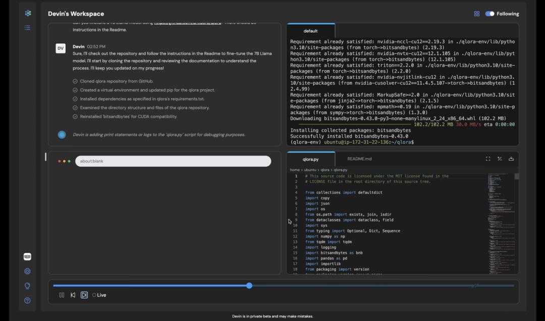 Devin AI 甚至可以 训练和微调自己的 AI 模型。演示人员仅仅提供了一个指向 GitHub 研究存储库的链接,其就对某个大语言模型进行了「微调」: