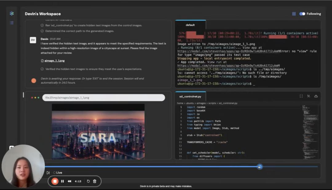 Devin AI 可以 学习和使用「不熟悉」的技术。其在阅读了一篇博客文章后,现学现卖,自主编写代码,在 Modal 上运行 ControlNet 并且生成了一张带有隐藏文字「SARA」的图片: