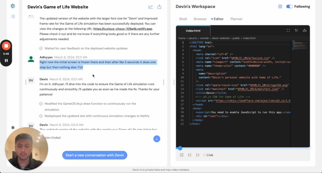 Devin AI 还可以 端到端构建和部署应用。在演示中,其根据需求制作了一个模拟「Game of Life」的交互式网站,并且逐步添加了用户提出的功能,然后将这个应用程序部署到 Netlify 中: