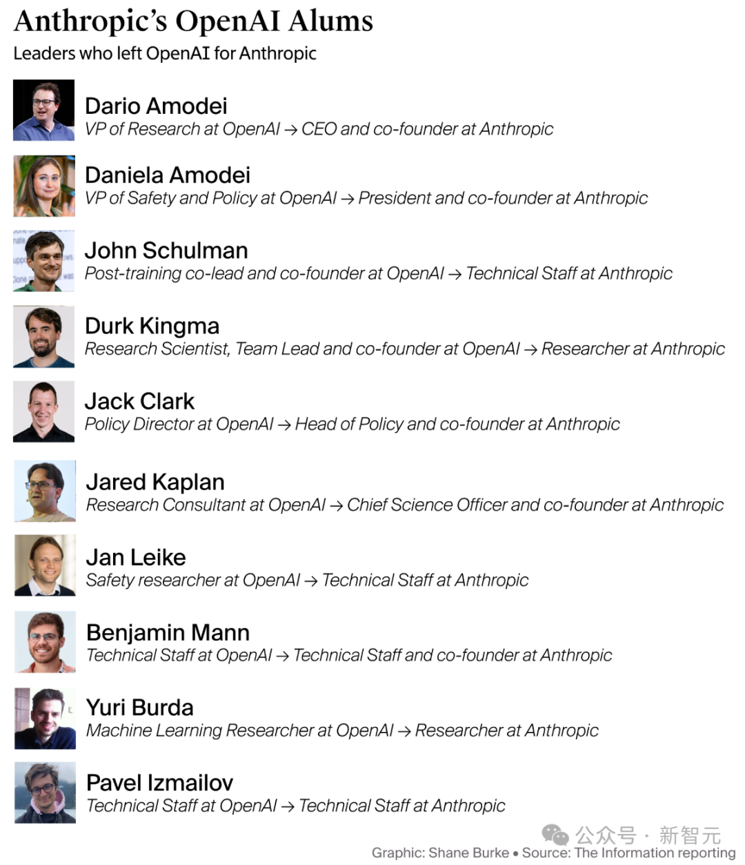 Information 统计了所有离职 OpenAI 加入 Anthropic 的成员名单,其中既有联创、安全项目负责人这样的大佬,也有普通研究员的加盟。不算 Amodei 兄妹两人,还有 8 位 OpenAI 员工纷纷叛逃。