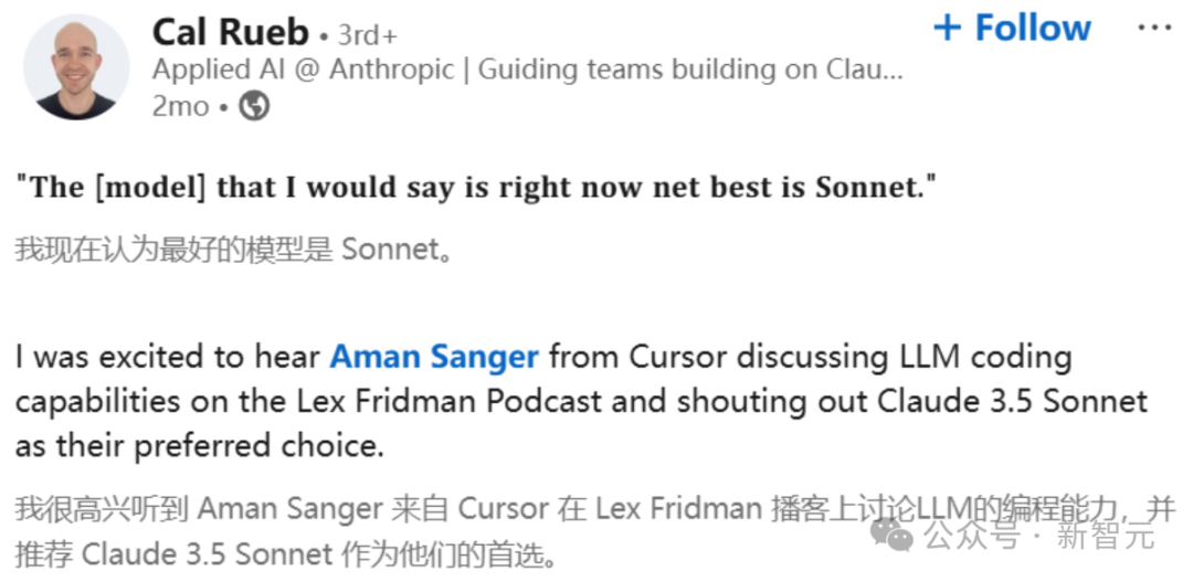 不仅如此,Cursor 的联合创始人 Aman Sanger 更是在 Lex Fridman 10 月的播客上对 anthropic 大加称赞: