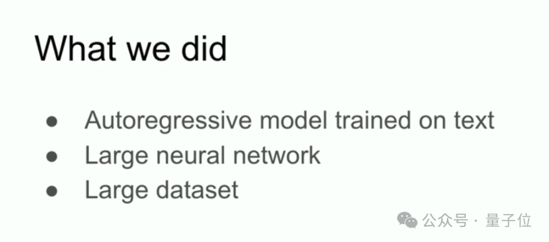 Ilya 展示了当时的一张 PPT,揭示了他和团队的核心工作:自回归模型、大型神经网络和大数据集的结合。