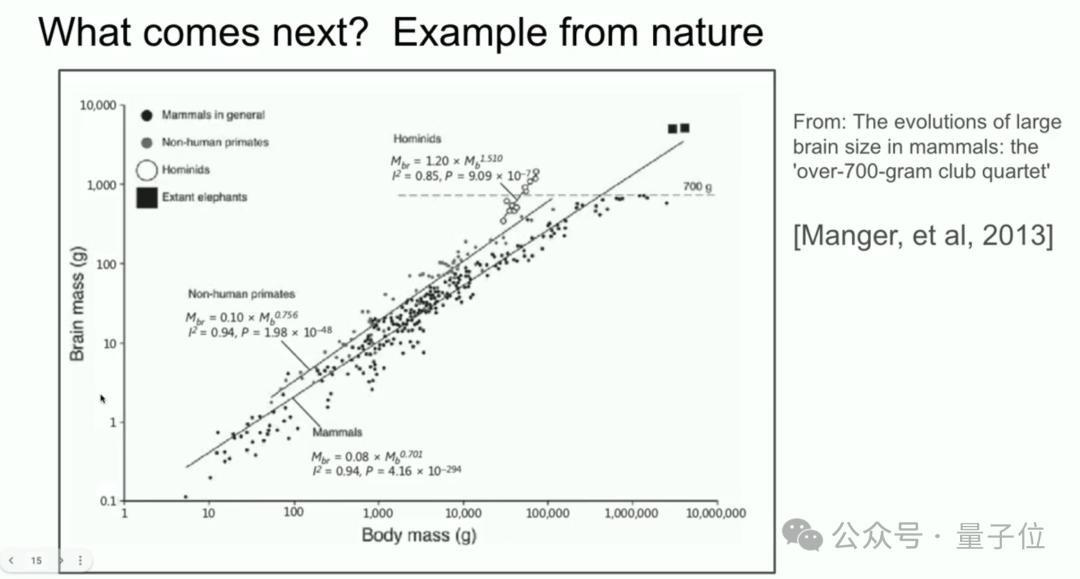 Ilya 还引用了一个生物学上的例子,展示了哺乳动物身体与大脑大小的关系,暗示不同生物可能通过不同的“规模法则”进化出不同的智能表现。