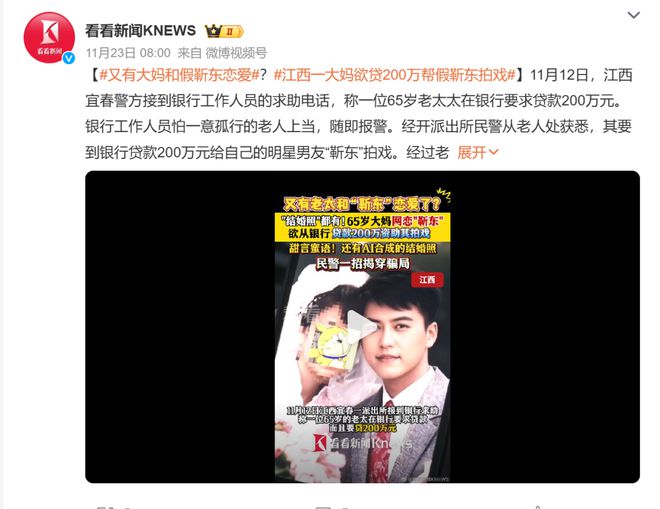据报道,今年11月,江西一位65岁老人到银行办理业务,声称要贷款200万元给男朋友“靳东”拍戏。经调查发现,老人手机里的“靳东”出自AI合成的视频。