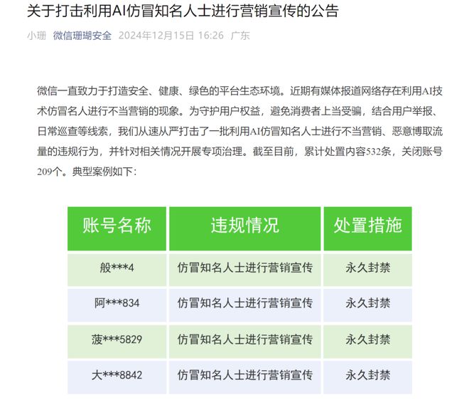 截至目前,累计处置内容532条,关闭账号209个。下一步,微信将持续对“利用AI仿冒知名人士进行营销宣传”等违规行为增加打击力度。