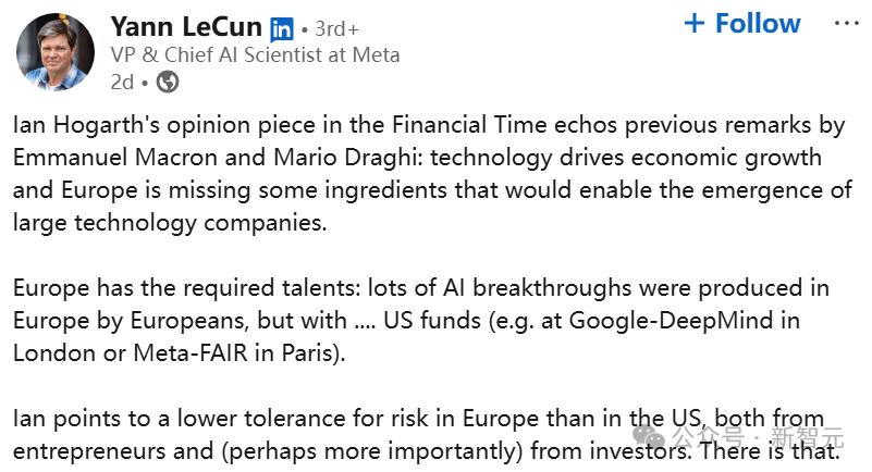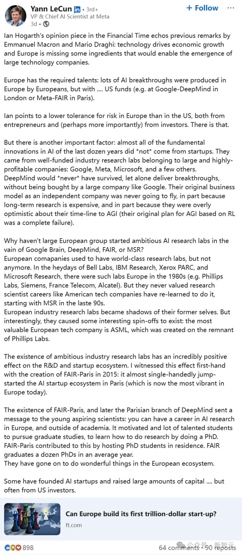 随后,LeCun在领英上转发了这篇文章,并补充了另一个重要因素:过去十几年里,人工智能领域几乎所有的基础性创新都不是来自初创企业,而是来自资金充足的大型行业研究实验室,例如谷歌、Meta、微软及其他少数公司。