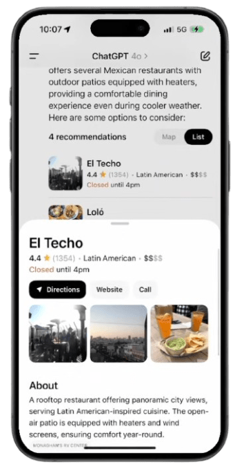 OpenAI在周一的直播中透露,ChatGPT Search已变得“更加迅速”,且可设为任何网页浏览器的默认搜索引擎。此外,移动端的体验亦获提升,用户现可查阅更有条理的企业信息,如地址(在iOS ChatGPT应用中可通过Apple Maps查看)和电话号码。
