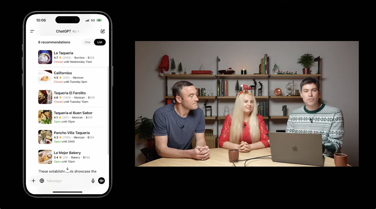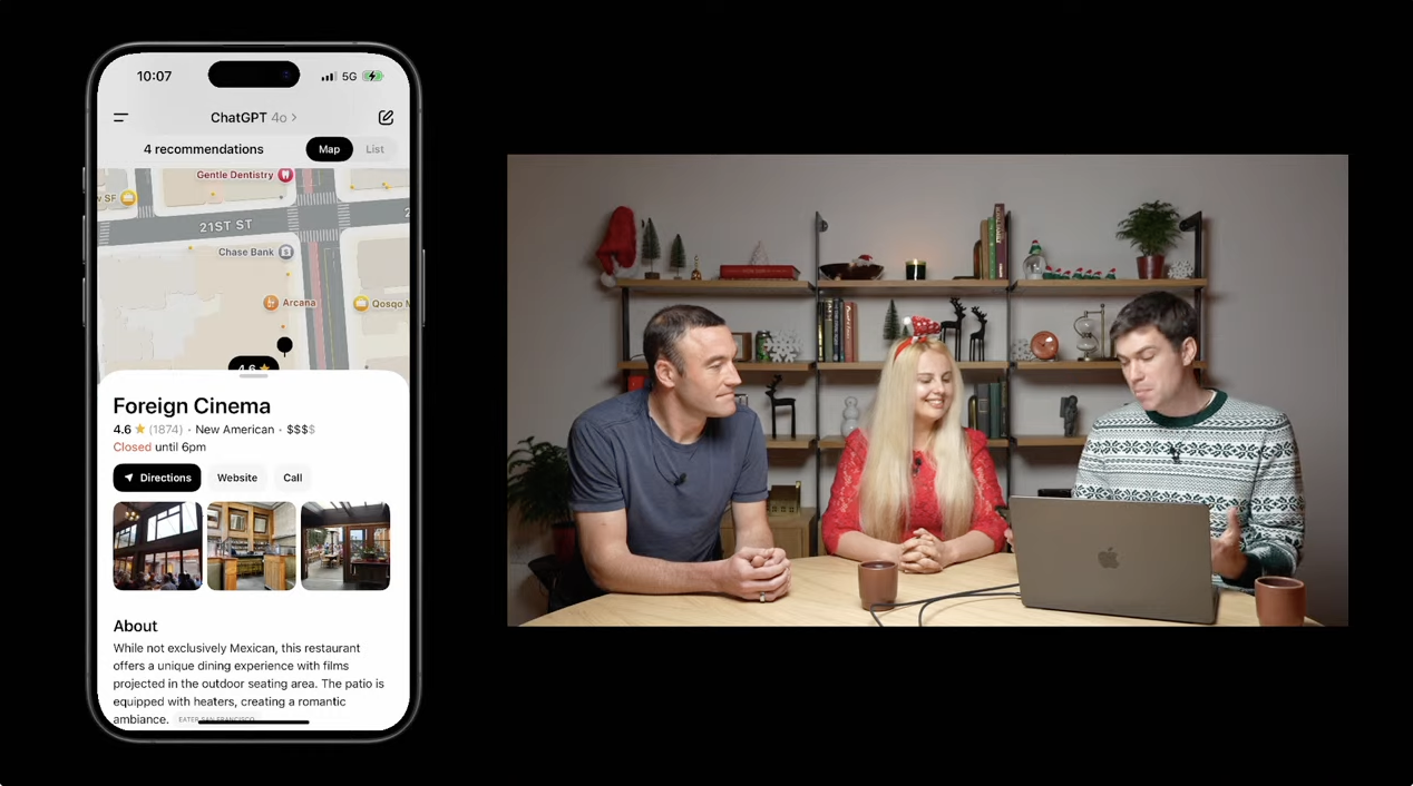 嫁入苹果大户人家的 ChatGPT,也让其享受到与苹果地图完美集成的本地化体验,点击地图按钮,就能直接查看这些商户,并使用本地的苹果进行实地浏览。