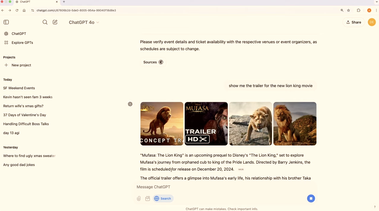 比如在讨论旧金山雨天活动选择时,想去看场电影,我们可以先在 ChatGPT 搜索并播放新版《狮子王》的预告片,降低踩雷的风险。