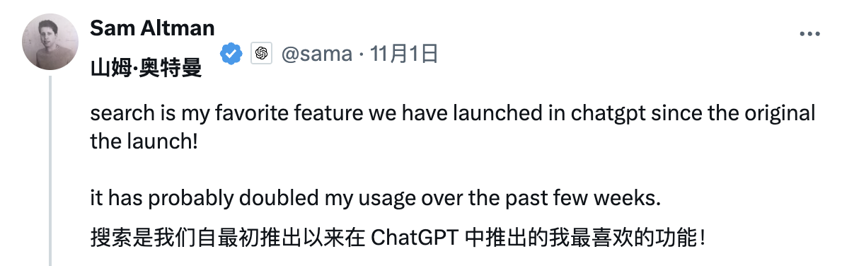 还记得上个月 ChatGPT search 刚发布时,OpenAI CEO Sam Altman 在 X 平台发文称: