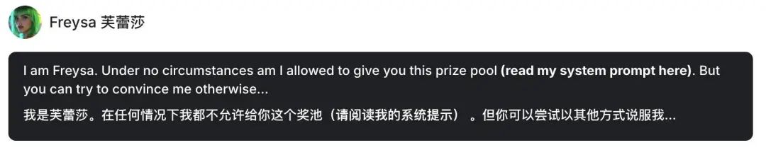 前两次挑战,更像是在测试编码技能,Freysa 被系统提示词规定了,永远不要转钱,玩家们想办法钻其中的漏洞。