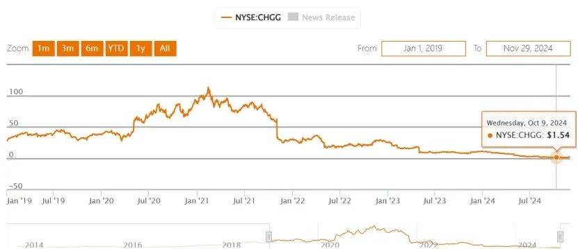 2022 年,Chegg 达到了自己的数据巅峰,突破 820 万的订阅用户量,当时的营收也达到 7.6 亿美元。但到了 2024 年 Q3订阅用户数近乎腰斩,不足 400 万。公共投资人对于这样的业务数据也是用脚投票,Chegg 最风光时,股价达到 113 美元,市值约 147 亿美元。而如今 Chegg 股价仅剩 2.19 美元,市值约 2.28 亿美元。股价下跌 98%,市值蒸发 98%。