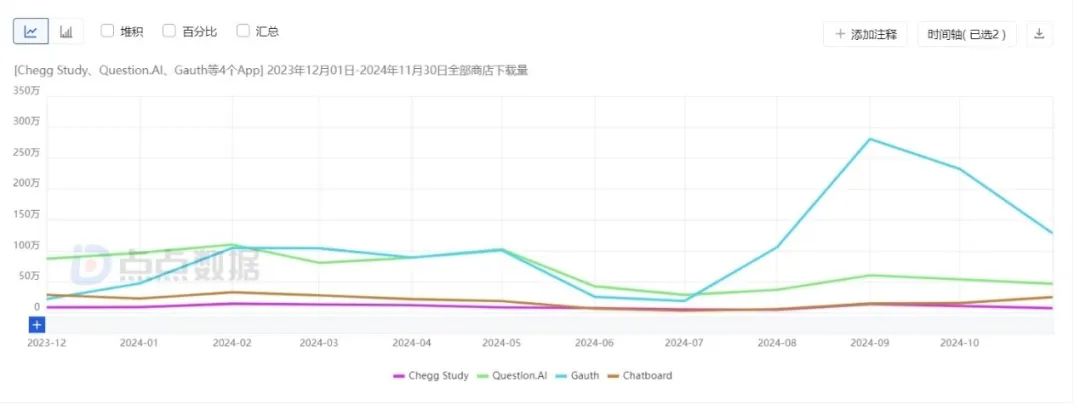 Gauth 2021 年 3 月上线,Question.AI 2023 年 5 月上线,Chatboard(后更名 Answer.AI)2023 年 3 月上线,产品近一年下载量均高于 Chegg Study | 图源点点数据