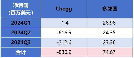 多邻国成立于 2011 年,凭借“广告+订阅”的商业模式于 2021 年成功在纳斯达克上市。据多邻国官方数据显示,订阅收入一直占总营收的 70% 以上,今年 Q2 以来保持在 80% 以上。相似的商业模式,同样经历了 ChatGPT 热潮,相比于 Chegg 2024 年前三季度累计净亏损 8 亿美元,多邻国财报显示同期净利润为 7467 万美元,同比增长 1790.3%(多邻国没有公布 non-GAAP 净利润数据,此处用净利润进行比对)。