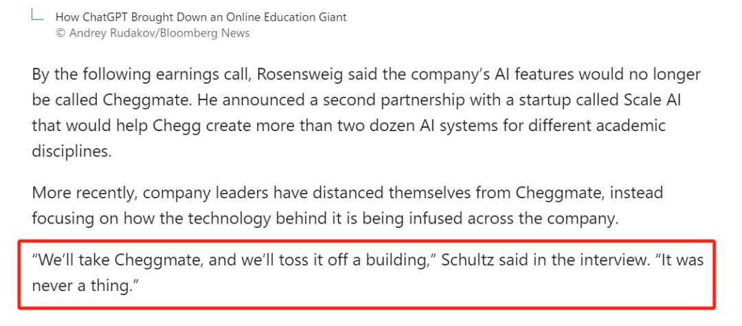 Dan 在采访中称“想把 CheggMate 从楼上丢下去”“它不值一提” | How ChatGPT Brought Down an Online Education Giant© Andrey Rudakov/Bloomberg News