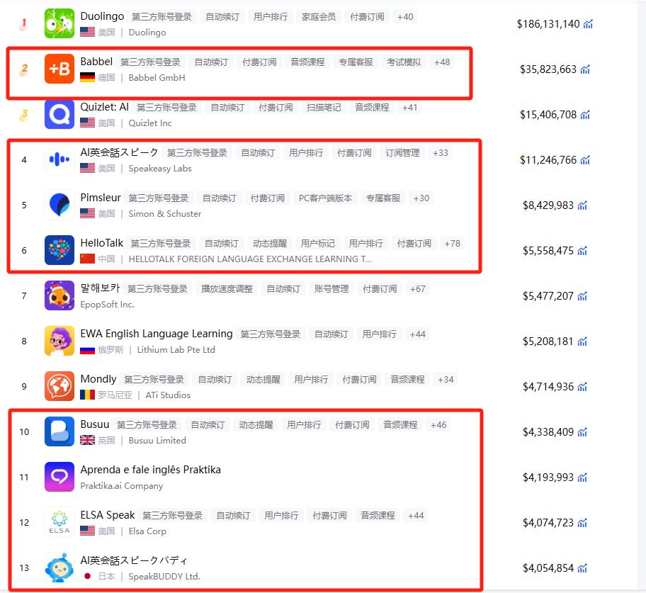 今年截至 11 月,iOS 端语言类收入榜前 13 位中,每款软件都含有口语练习功能,其中 8 款专攻口语学习