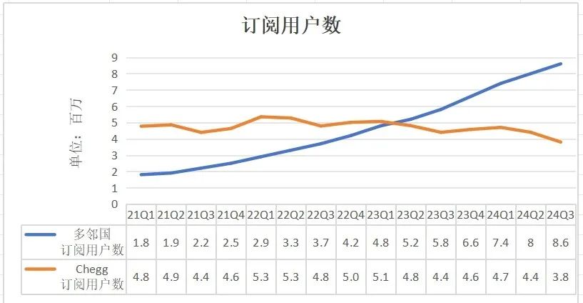 如果关于“钱”的数据,还能通过一些策略稳住,对 Chegg 来说最为核心的指标订阅用户数的曲线,更加直观体现变化。