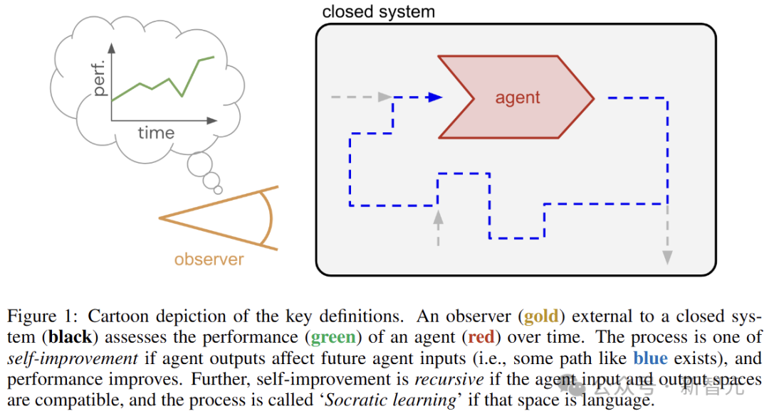 考虑蓝色虚线的路径,让智能体输出影响未来的智能体输入,并且性能得到提高(自我改进过程),如果输入和输出空间兼容,则这种自我提升是递归的。