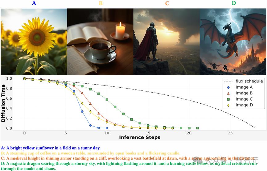 2. 经典的扩散模型所有的图片都采用了同样的去噪策略和步数;而显然不同复杂度的图像对于人类来说生成难度是不一样的。