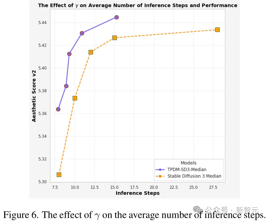通过调节不同的γ值,模型能在图像生成质量和去噪推理的步数之间取得更好的平衡,仅需要更少的平均步数就能达到与原模型相同的性能。