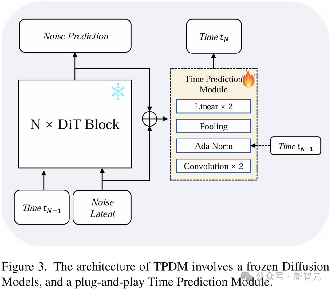 为了实现这一目的,在网络中引入了一个即插即用的时间预测模块(Time Prediction Module, TPM)。这一模块会预测在当前这一个去噪步骤执行完毕之后,模型应当在哪一个diffusion time下进行下一步去噪。