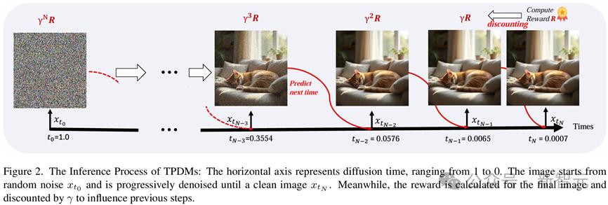值得注意的是,类似于LLM对思维链进行的动态优化,对扩散模型时间进行优化的时候也需要动态地进行,而非仅仅依据输入的prompt;换言之,优化过程需要根据推理过程生成的「图像链」来动态一步步预测图像链下一步的最优去噪时间,从而保证图像的生成质量满足reward指标。