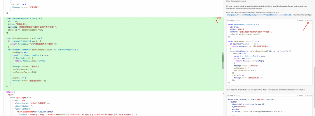 而 Cursor 通过 Apply 解决这个问题,它将左侧的原始代码与右侧需要修改的部分放在一起,由大语言模型负责重写左侧所有内容。之后,IDE 在本地将重写后的代码与原代码进行差异比较后,将 Diff 展示给用户,使用户能够有选择性地采纳这些改动,并将其插入原有代码之中。