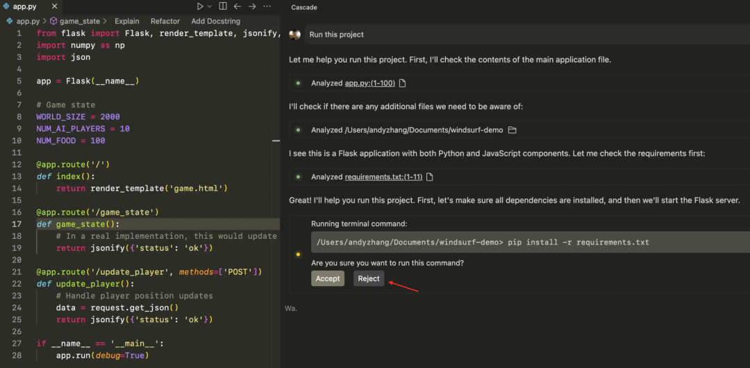 Cursor 能够智能地识别并重写周边需要调整的部分。它会获取由模型修改后的代码段,并与本地代码进行比对,在编辑器中标示出差异之处。这样一来,Cursor 不仅能够自动修正代码中的错误,还能在更改变量名时同步更新所有相关引用,确保代码的一致性和准确性。