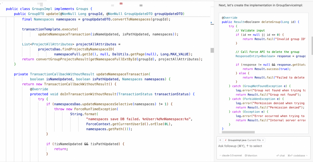 至于“Apply”功能,同样体现了其便捷性。大多数 IDE 插件或客户端都具备聊天对话框的功能,如上所述,右侧展示的是 Cursor 为我生成的新代码。但如何地将这部分“生成的代码”插入左侧现有代码中,往往会很棘手,因为可能需要手动去找插入位置,大部分时候还要解决新代码和原代码之间冲突,所以代码会话框的利用率并不高。