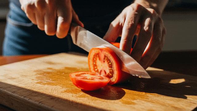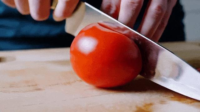 举个栗子,我们用相同的提示「A pair of hands skillfully slicing a ripe tomato on a wooden cutting board」生成一个切西红柿的视频。