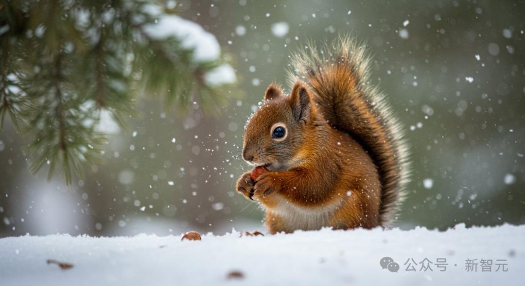 下面这种冬日雪地中红松鼠的特写,仿佛高清大片,无论是松鼠的皮毛、空中的雪花,还是背景中松针的虚化,都体现出了细节的考究。