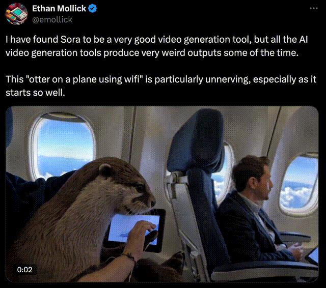 沃顿商学院教授Ethan Mollick实测Sora时,结果发现水獭在飞机上使用WiFi的画面中,长出了人类的手,非常诡异。